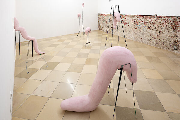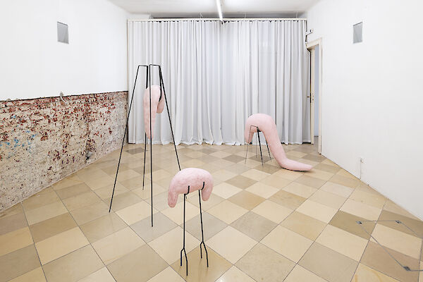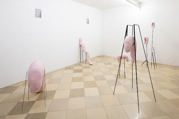 Fleischfarbene, körpergroße Skulpturen ersehnen ein Eigenleben, wollen sich aufrichten, wollen hängen, liegen, lehnen, können nur durch fragile Metallapparaturen gestützt bestimmte Haltungen einnehmen.