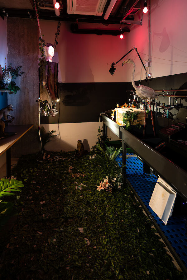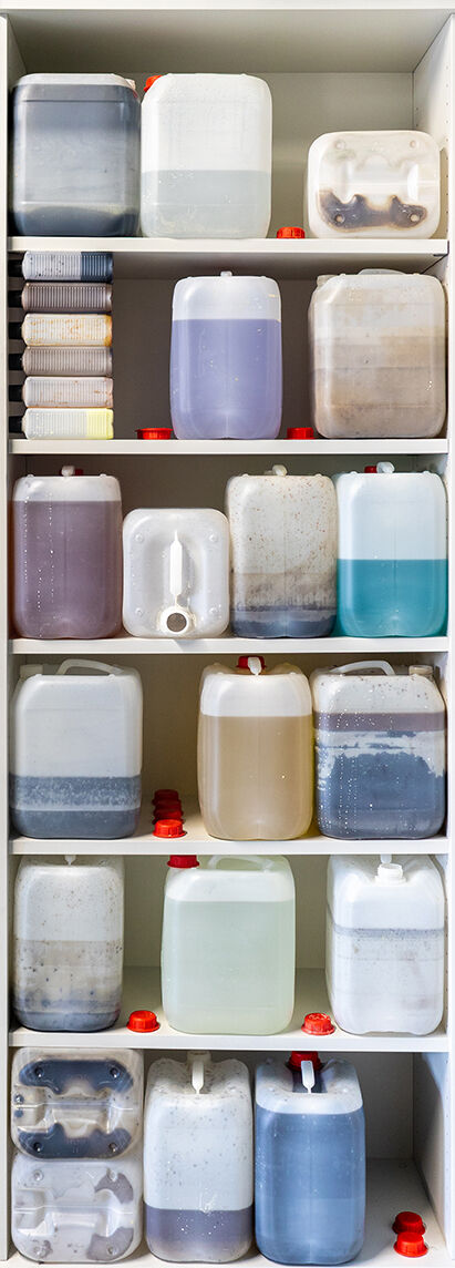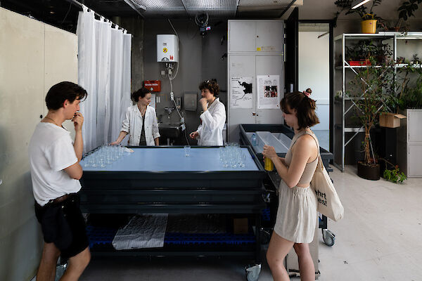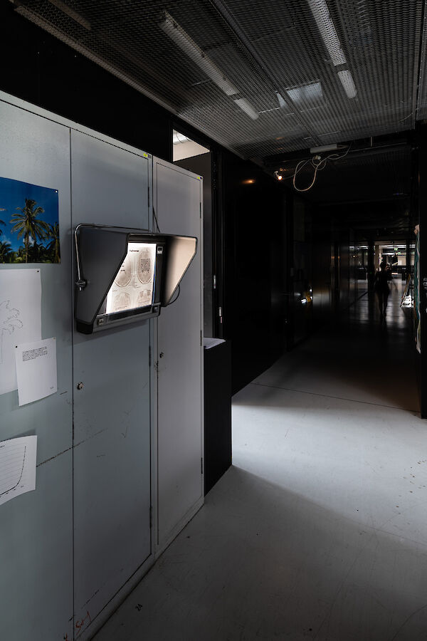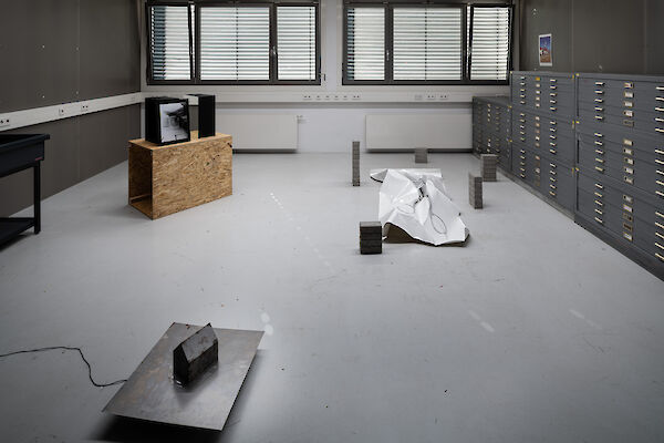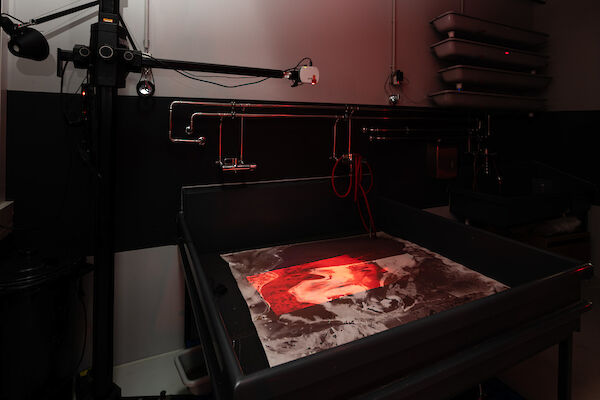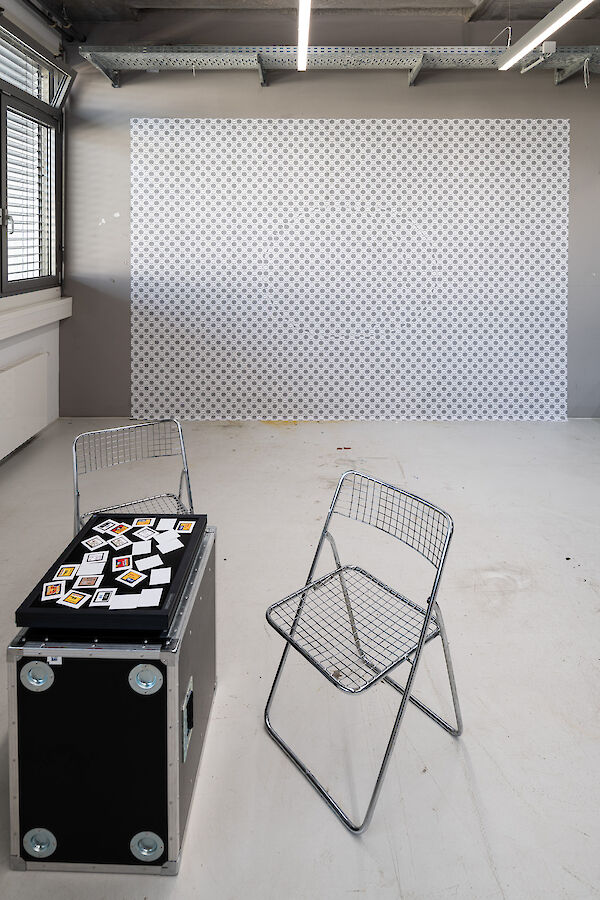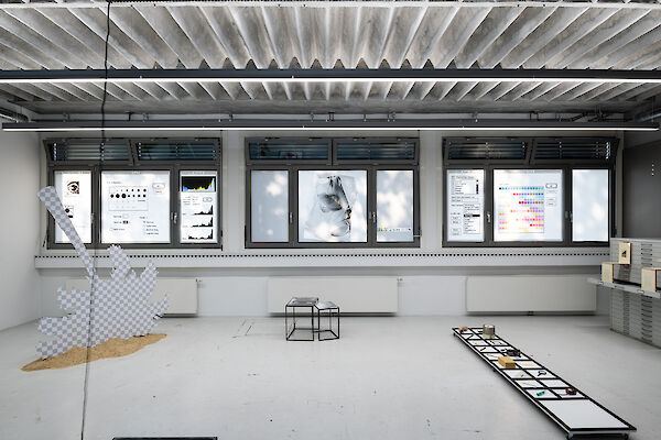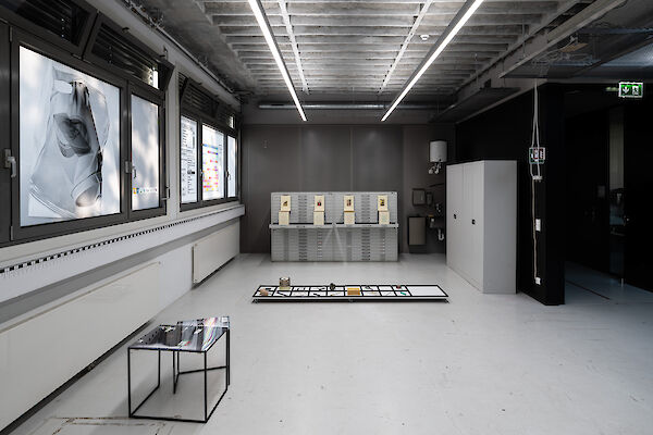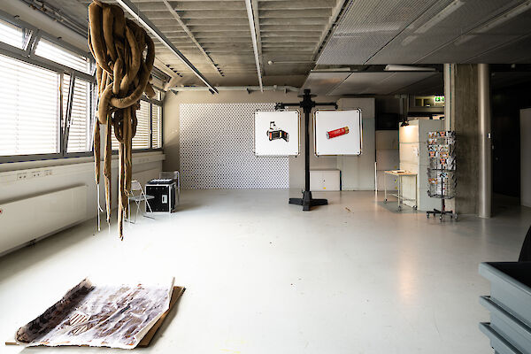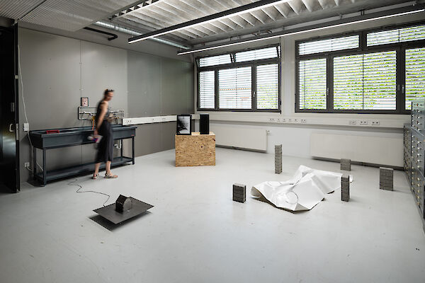 Anhand eines Ausstellungsdisplays zwischen Mimesis und Mock-Up materialisieren die Studierenden analoge und digitale Arbeitsumgebungen der fotografischen Produktion: Im Hellraum der Fotoklasse wird die Oberfläche samt Bilderebenen eines digitalen Bildbearbeitungsprogramms gegenständlich. Die Dunkelkammer, sonst hermetischer Arbeitsraum, wird zum performativen Schauplatz, fotografisches Equipment zur Akteurin. Die Fotografie schwingt zwischen ihren möglichen Rollen als Spiegel, Schusswaffe, Körperprothese, zweite Haut, ...?