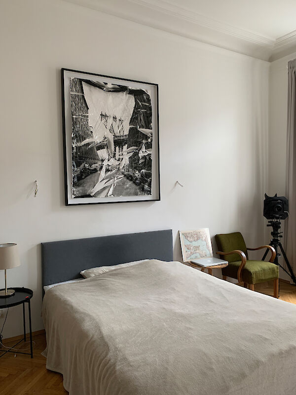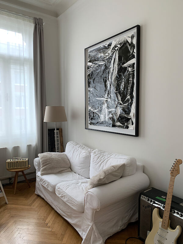 Mahir Jahmals Arbeiten stammen aus der großformatigen analogen Fotografie und untersuchen die Grenzen des Mediums. Indem er in der Dunkelkammer experimentiert, untersucht er mögliche Übergänge von der traditionellen Fotografie zu neuen Formen der künstlerischen Praxis. Dabei verschmelzen Elemente der Malerei mit der Fotografie. Das Zerknittern des Papiers fügt skulpturale Formen hinzu, die einen reliefartigen Eindruck hinterlassen. Urbane Motive lösen sich in grafische Strukturen auf und oft entsteht das zugrunde liegende Motiv erst auf den zweiten Blick. Im Rahmen von Jahmals Bildern bilden leere Stellen, Papierbrüche und optische Unschärfen raue Landschaften, die den Eindruck einer verzerrten Realität hinterlassen. Er entwickelt fotografische Techniken, die mysteriöse Bilder erzeugen, die Normen trotzen und neue Perspektiven ermöglichen.