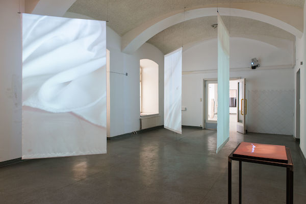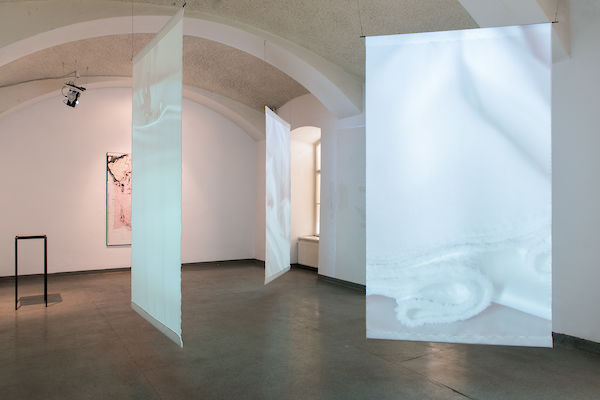 Olena Newkryta erzeugt in ihrer Ausstellung medienübergreifend und installativ ein Netz an Überlegungen, in das die Besucherin eingebunden wird. Dabei liegt der Fokus auf der Körperlichkeit des fotografischen und textilen Materials, dem Arbeitsprozess, der Berührung, dem Verhältnis von Sehen und Spüren. Durch Close-Ups, direkte Eingriffe in das Material und dessen Abtastung wird ein Perspektivenwechsel vom distanzierten Blick zum Körperkontakt geschaffen. Somit entsteht eine visuelle Sprache der Berührung, die eine Verbindung zwischen haptischer und optischer Wahrnehmung herstellt. Die einzelnen Werke stehen für sich, doch – im Sinn von Gilles Deleuze – entstehen unter ihnen vielfältige Berührungspunkte und Verbindungen, welche multiple Betrachtungsebenen schaffen. Videoinstallation, Scanbild und Künstlerbuch verbinden sich in der Ausstellung zu einem sicht- und berührbaren Display.