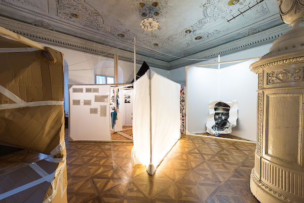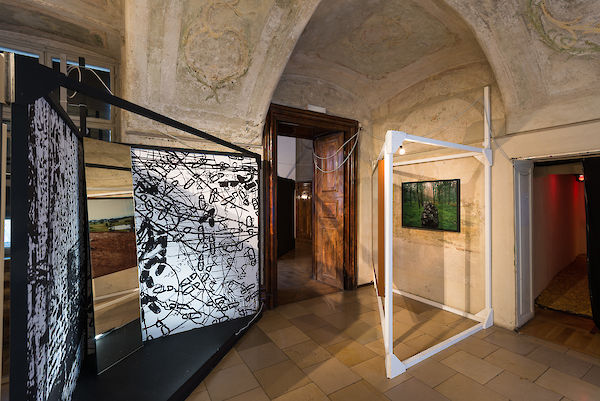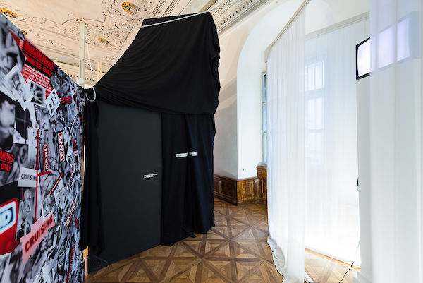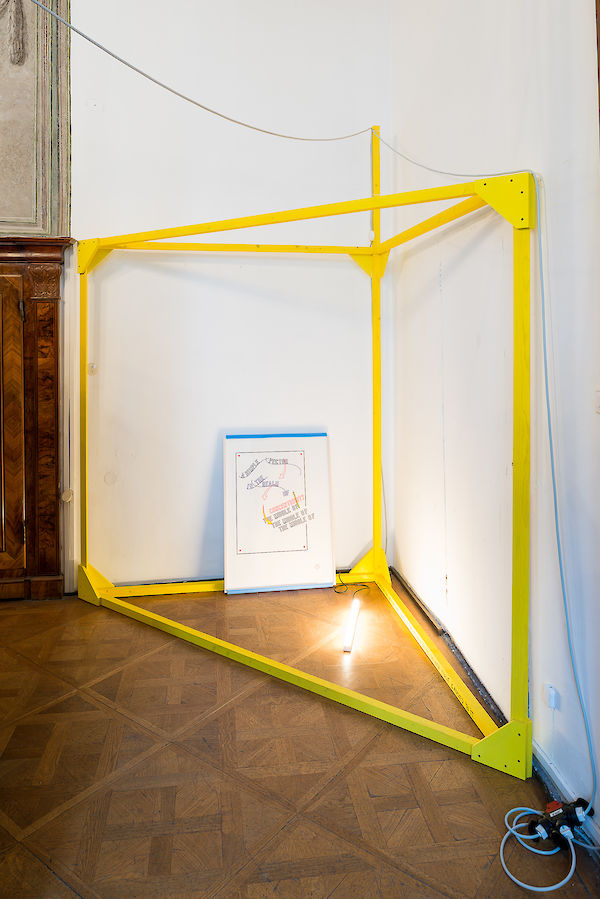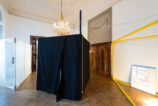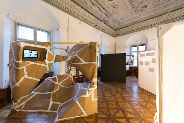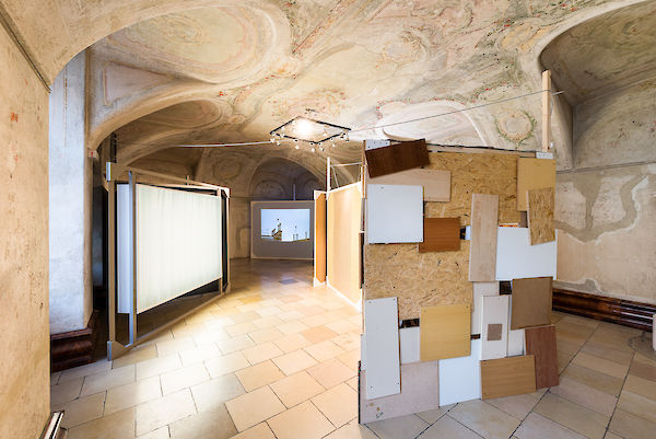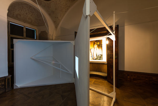 Für jede einzelne künstlerische Position wurde ein zu bespielendes Prisma gebaut, das sich als Ausstellungsmodul mit den benachbarten Räumen vernetzt. Eingepasst in die barocken Wohnräume des Heiligenkreuzer Hofes verspannen sich diese zellenartigen geometrischen Formen, bilden neue Einheiten, brechen mit der Symmetrie und erschaffen ein informell wucherndes Raumgeflecht.